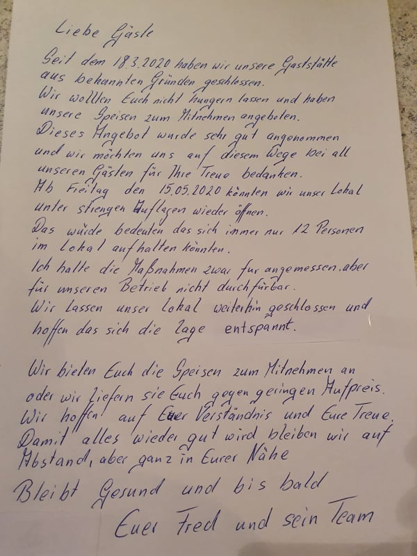 13. Mai 2020 Mitteilung vom Wirt Folgend ein offener Brief von unserem Gastwirt und der Mittagstisch von Mai bis Juni!