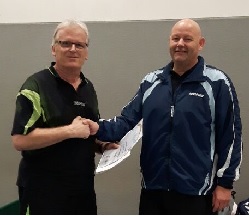 Volker Proschek (Foto rechts) wurde vor dem Spitzenspiel gegen Nordshausen mit der bronzenen Spielernadel des hessischen Tischtennis-Verbandes ausgezeichnet. Abteilungsleiter und Mannschaftskamerad Bernd Ziepprecht (Foto links) freute sich, diese schöne Auszeichnung zu übermitteln.